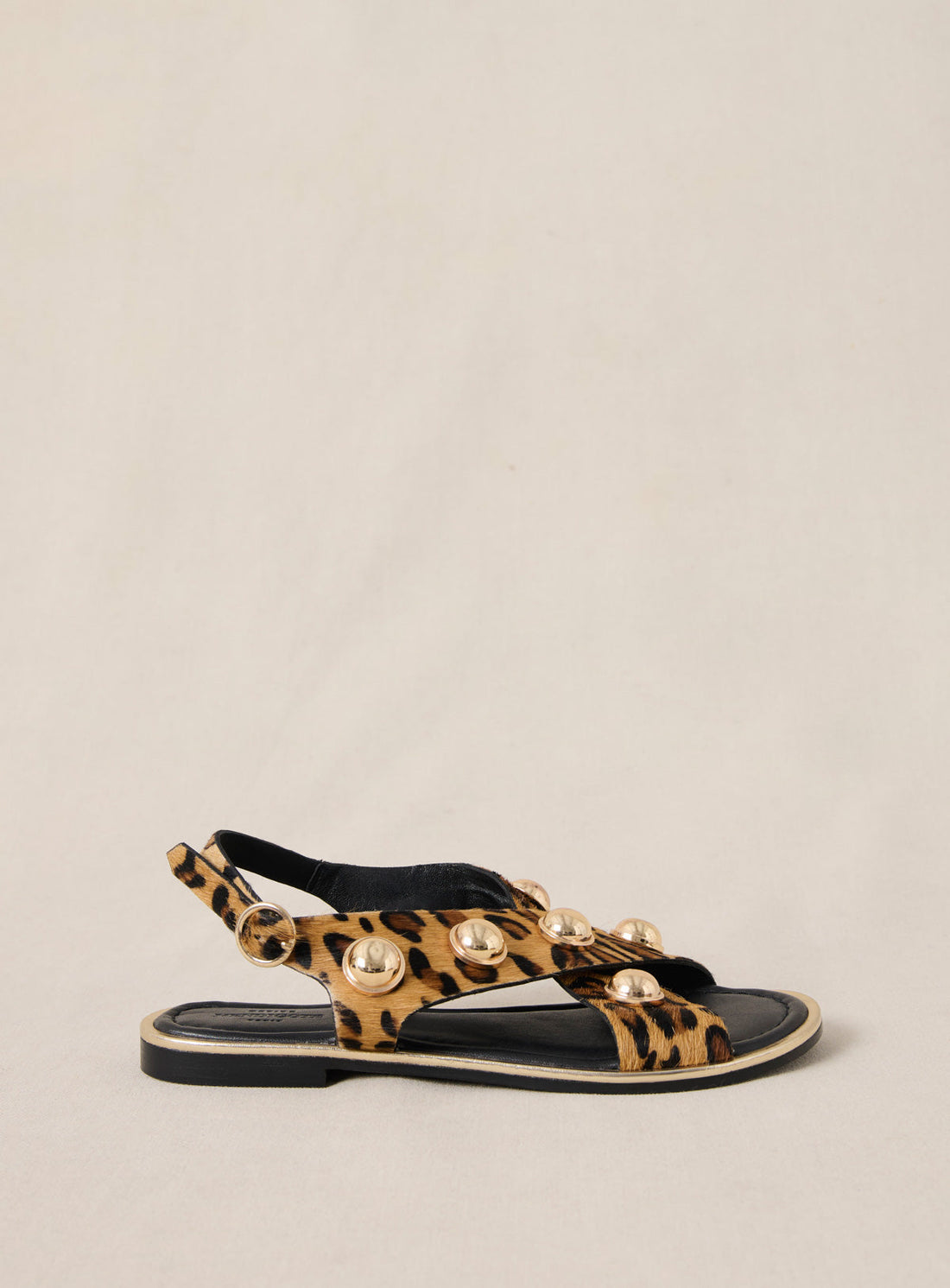 - Sandales plates - Cuir pony léopard - Détails rivets dorés - Lanières entrelacées - Fermeture...