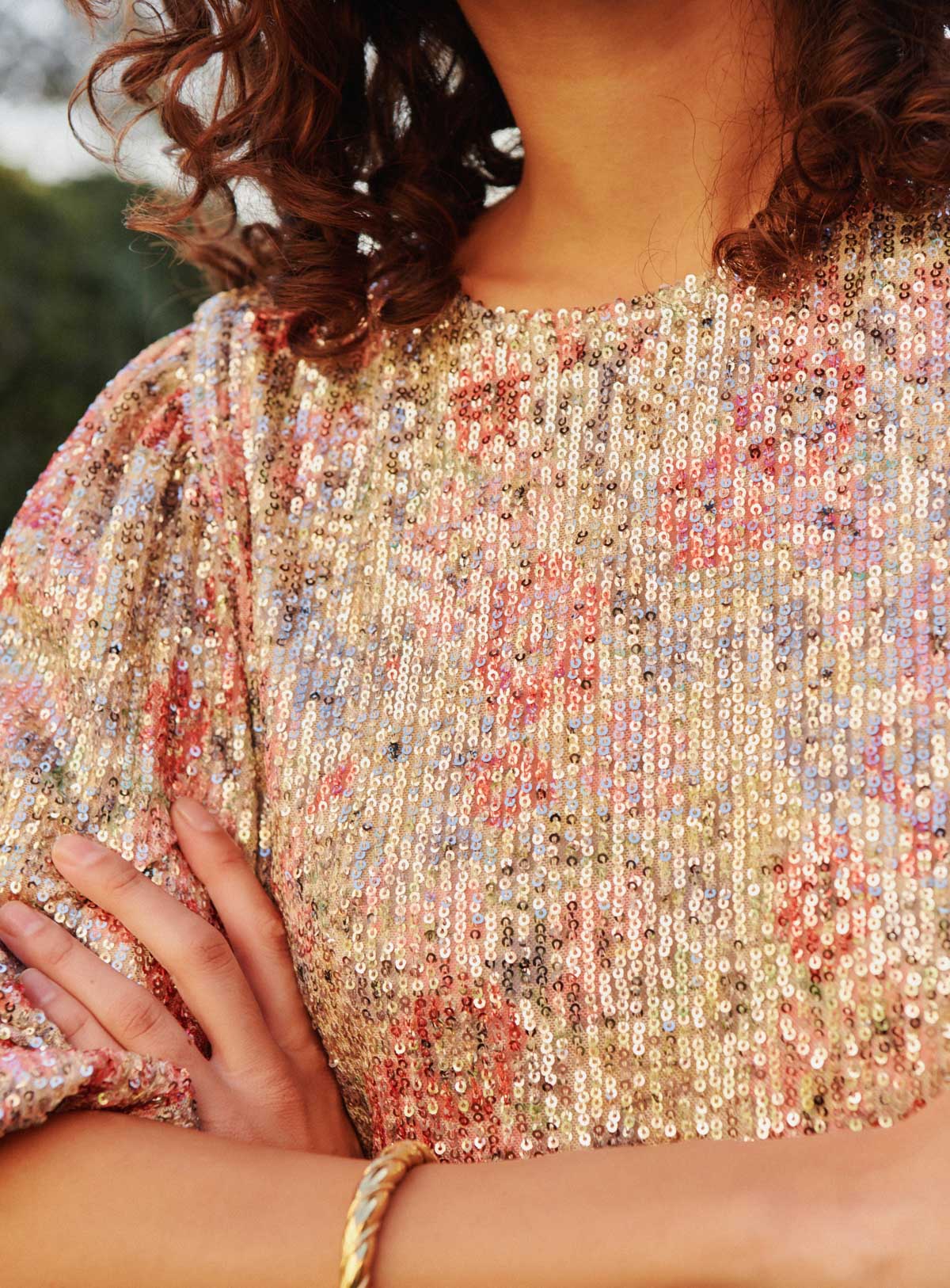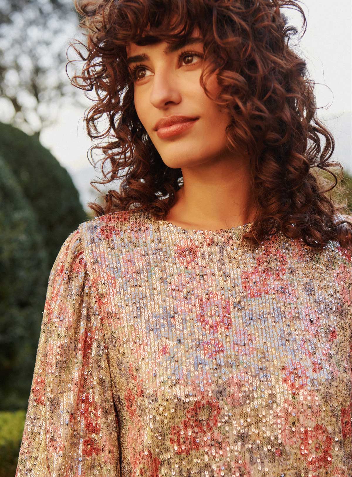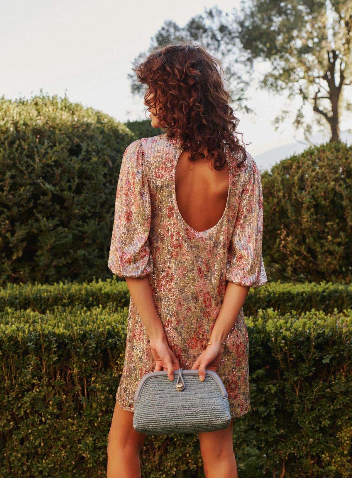 Pourquoi nous l'aimons : Cette robe élégante et lumineuse est parfaite pour une occasion spéciale. Son tissu brodé de sequins capte la lumière avec raffinement, tandis que son dos ouvert apporte une touche féminine et sophistiquée.