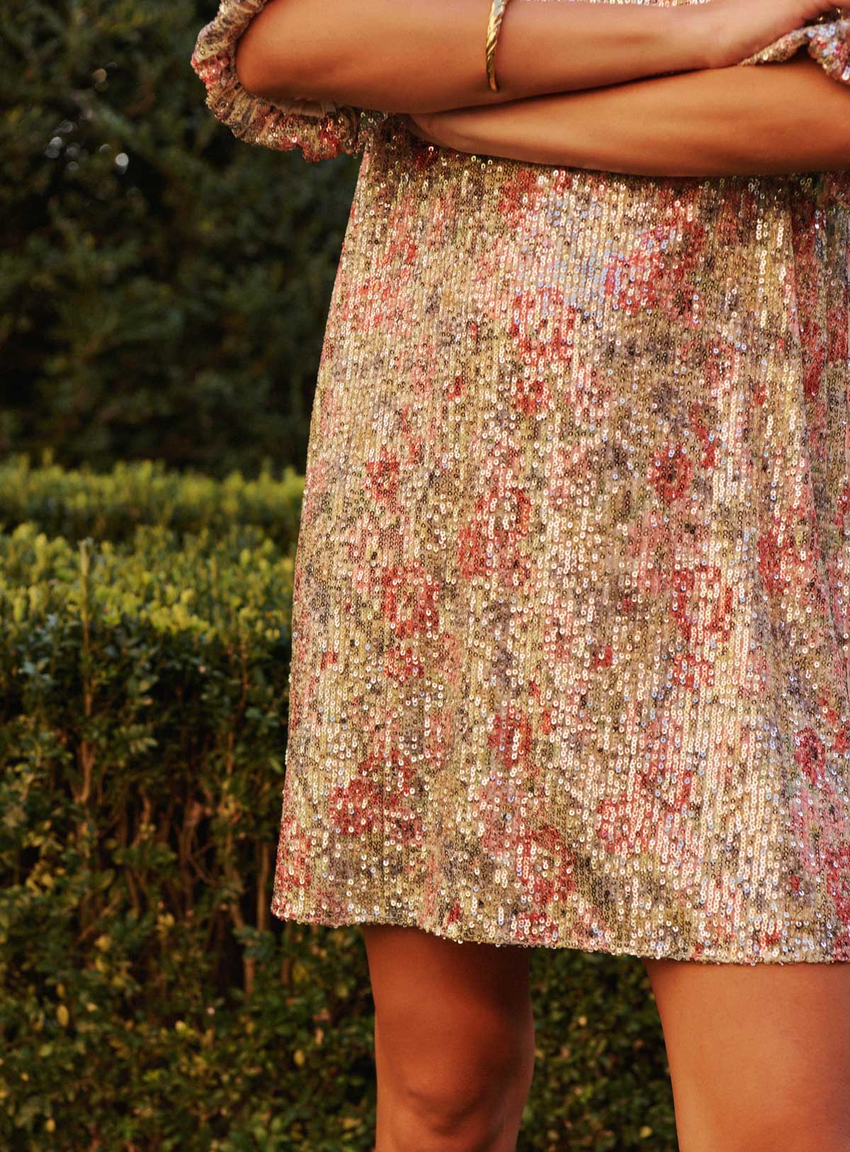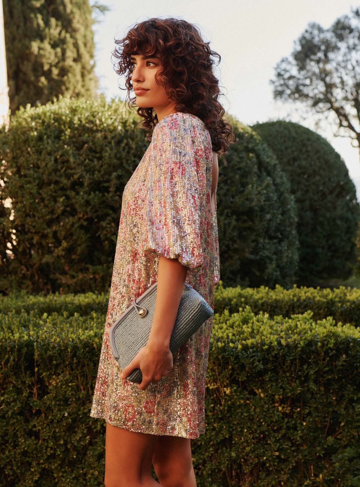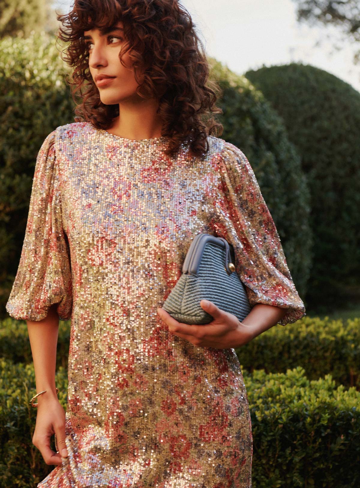 Pourquoi nous l'aimons : Cette robe élégante et lumineuse est parfaite pour une occasion spéciale. Son tissu brodé de sequins capte la lumière avec raffinement, tandis que son dos ouvert apporte une touche féminine et sophistiquée.