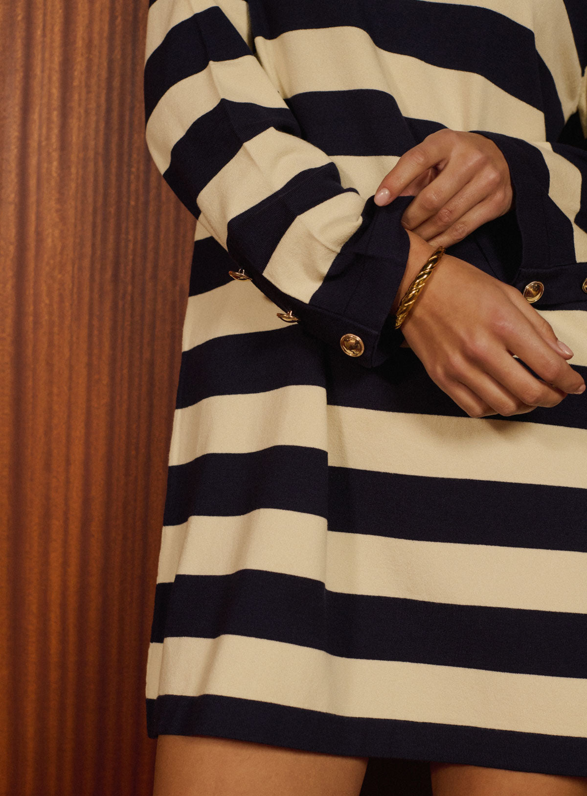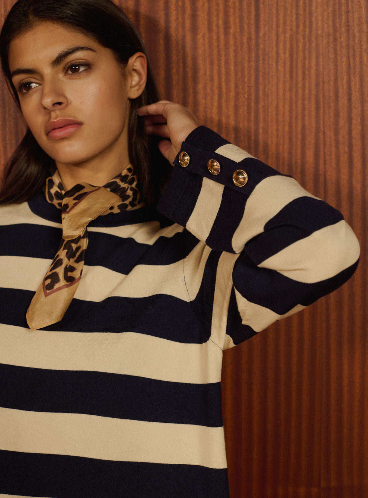 Pourquoi nous l'aimons : Cette robe pull rayée marine combine confort et style avec sa coupe droite et ses finitions soignées. Idéale pour une journée décontractée ou un look casual chic, elle se porte facilement avec des bottes ou des baskets.