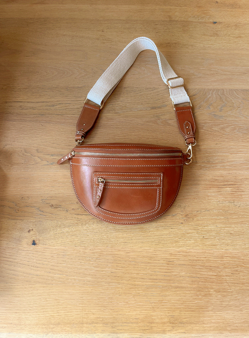 Dans ma banane Sana, j'ai : mon porte cartes, mes clés, mon baume à lèvres, mes écouteurs, mes lunettes de soleil, ma pince, un foulard, sans oublier ma ligne directe avec le monde (mon téléphone).